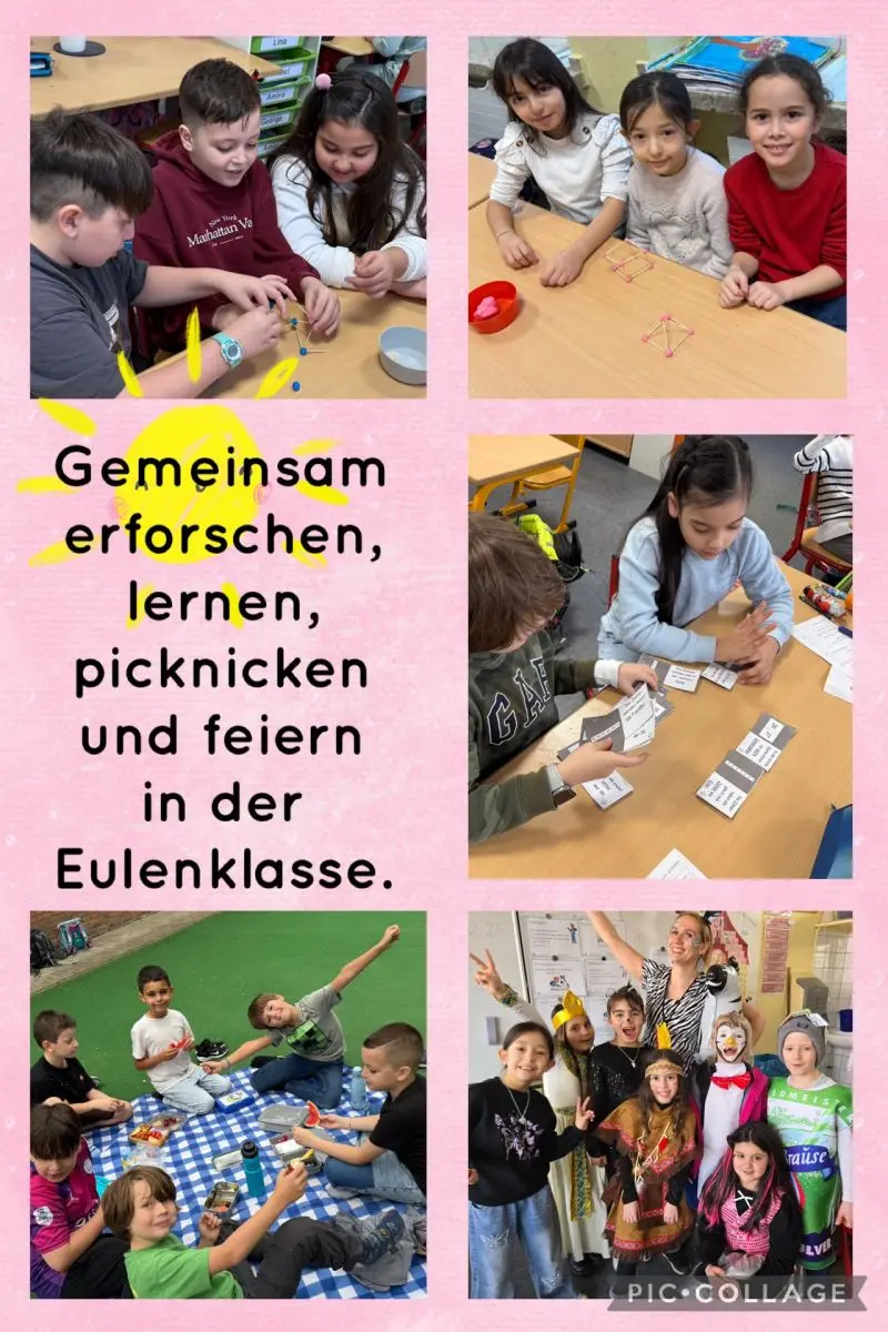 Unsere Lehrerin heißt Frau Riest. Sie ist nicht auf dem Foto zu sehen, denn sie hat das Foto gemacht. Dieses Bild wurde in der deutschen Oper am Rhein vor der Ballettaufführung „Ruß“. Auf dem Bild könnt ihr auch unser Klassentier die Eule Ole sehen.